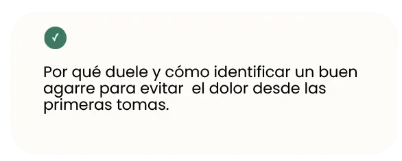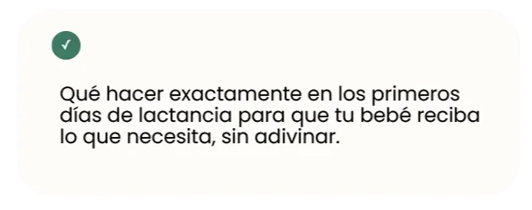 Te ofrezco una guía clara y práctica para lograr una lactancia segura, sin dolor y sin estrés desde el día uno. Te enseñaré qué hacer y qué evitar desde las primeras horas para que vivas tu lactancia con más calma y confianza.